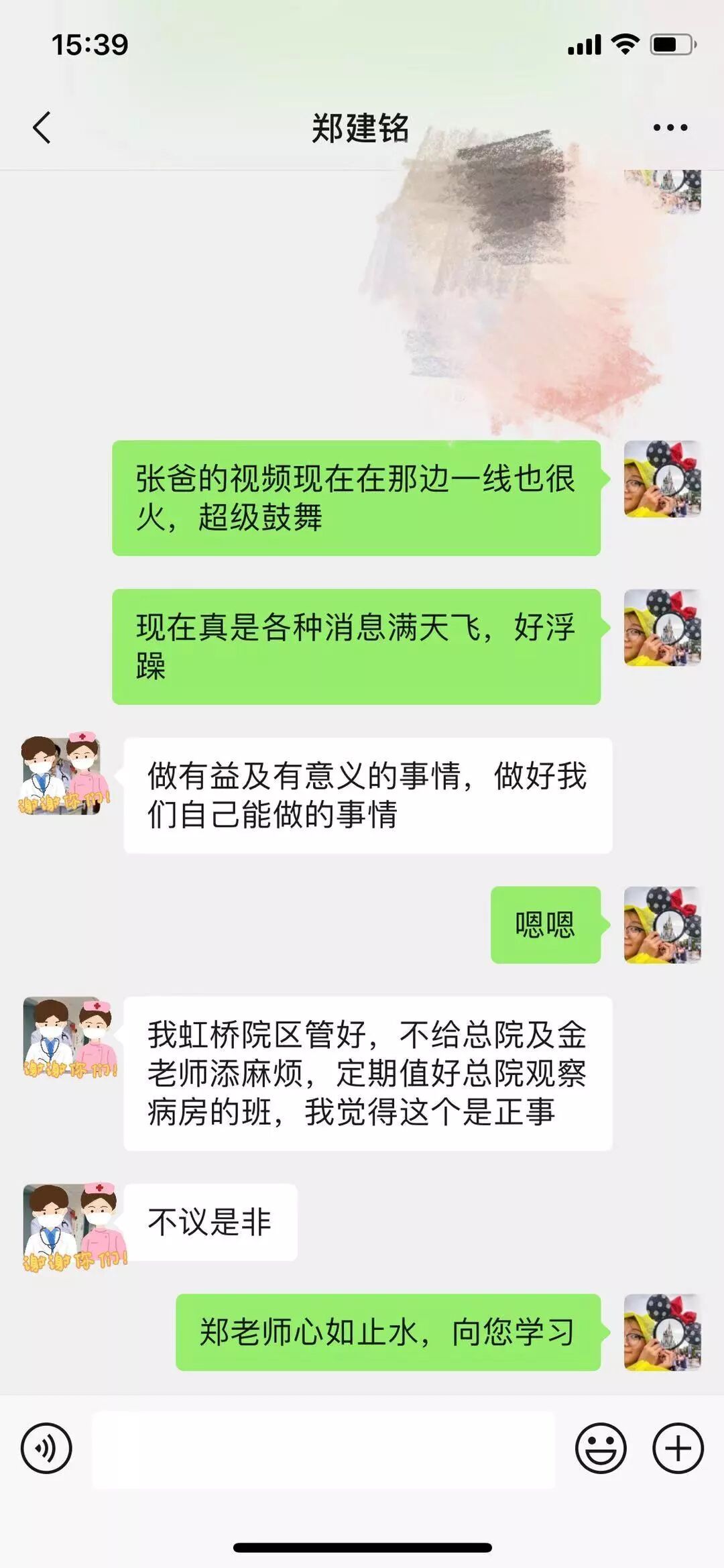 最近各种消息满天飞,我们难免浮躁,郑老师还教育我说“要做有益及有意义的事情,做好我们能做的事情。把虹桥院区管好,不给总院和金老师添麻烦,定期值好总院观察病房的班,我觉得这个是正事,不议是非”。